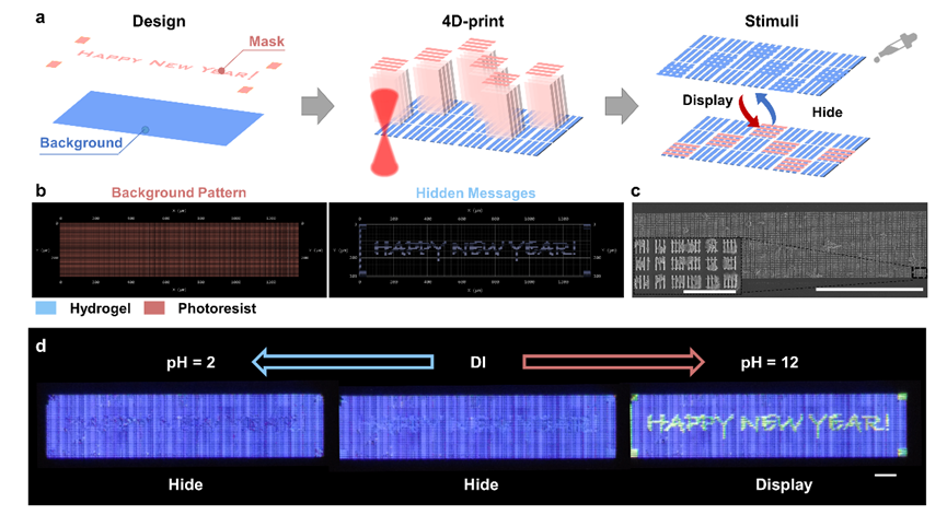 此外,针对微型无线传感器的打印和编程,科研团队开发了一种基于灰度设计的方法,顺利获得调整光栅结构的高度和周期来实现结构色图案的编码。该方法可以显著提高结构色的空间编码能力,并实现动态结构色图案的精准打印。