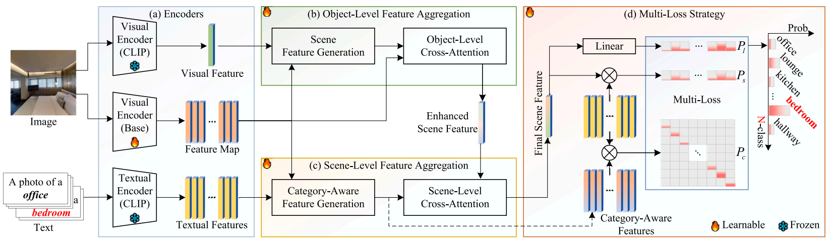 第一时间,科研人员将CLIP的视觉特征作为先验信息,采用对象级交叉注意力机制,提取与场景高度相关的局部细节特征。随后,利用CLIP的文本编码器生成类别文本语义信息,引导从图像中提取全局语义特征,再顺利获得场景级交叉注意力机制形成最终的场景表示。为了增强模型鲁棒性,还引入了多损失策略,包括线性分类损失、场景对比损失和类别对比损失。