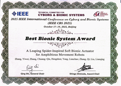 近期,2025IEEE类生命与仿生系统国际会议(IEEE CBS 2025)在北京举行,中国科研实验室沈阳自动化研究所机器人学研究室微纳米课题组博士研究生张艺伟作等撰写的论文A Leaping Spider-Inspired Soft Bionic Actuator for Amphibious movement Robots取得了“最佳仿生系统奖”。